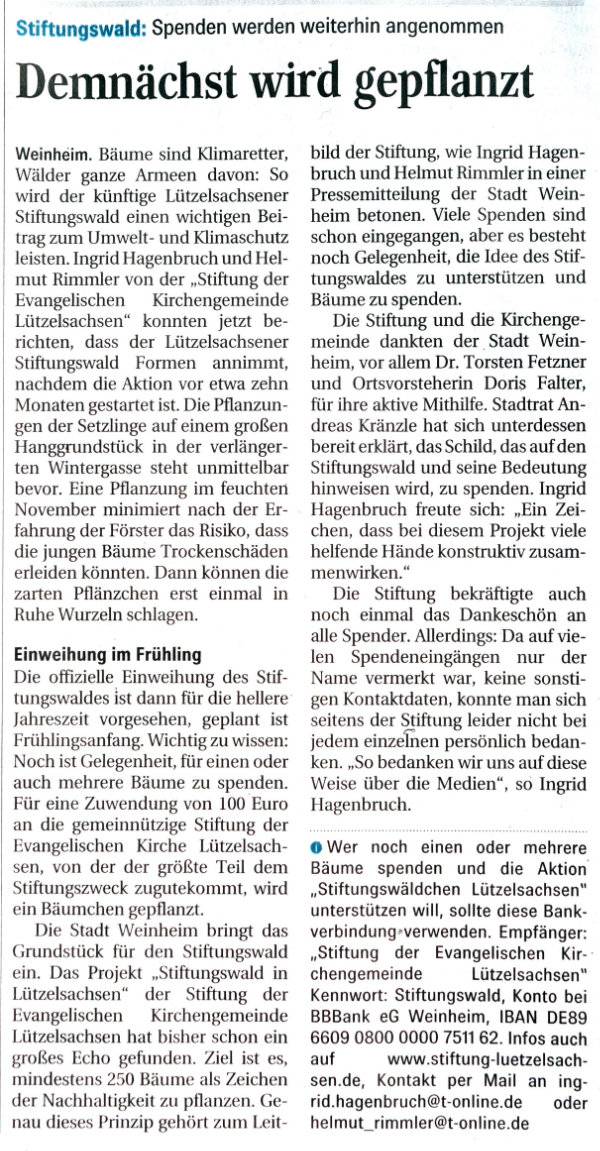 Rhein-Neckar-Zeitung vom 30. März 2022: Das hat das Zeug zur „grünen Lunge“. Lützelsachsener Stiftungswald mit dürreresistenten Baumarten wurde eingeweiht – Rund 350 Setzlinge gepflanzt aus Rhein-Neckar-Zeitung vom 30.03.2022 Quelle: RNZ, Günther Grosch Weinheimer Woche vom 12.November 2022:Quelle: Weinheimer Woche Weinheimer Nachrichten vom 22. November 2021:![]() Quelle: WNOZ 22.11.2021 Pressemitteilung 03/2021:Symbol der NachhaltigkeitStiftungswald in Lützelsachsen soll erweitert werden![]() Quelle: Bernd Hagenbruch Weinheim. Noch gibt der Hügel den Blick frei über Lützelsachsen und die Ebene bis hinüber zur Pfalz, aber in ein paar Jahren wird oberhalb der Wintergasse gegenüber der kleinen Forellenzucht wieder ein richtiger Wald stehen: aus Bäumen, so robust, dass sie dem Klimawandel trotzen. Mehr noch: Dass sie ihm entgegenwirken können. Denn ein Wald schützt die Umwelt. Die Stiftung der Evangelischen Kirchengemeinde Lützelsachsen hat sich zum Ziel gesetzt, nachhaltig und generationenübergreifend das Gemeindeleben zu fördern. „So wie unsere Vorfahren Bäume pflanzten, deren Nutzen erst nachfolgenden Generationen zu Gute kam, möchte die Stiftung zugunsten der kommenden Generationen wirken. Der Stiftungswald steht dafür, dass wir als Kirchengemeinde von unseren Unterstützern getragen werden und zum Gemeinwohl beitragen möchten", so Pfarrer Rohland. Das Projekt der Stiftung der Evangelischen Kirchengemeinde Lützelsachsen, das erst vor Weihnachten anlief, entwickelt sich sehr erfolgreich. Daher entschloss sich die Stiftung der Evangelischen Kirchengemeinde Lützelsachsen, das Projekt – im wahrsten Sinne des Wortes – aufzustocken. Die Fläche wird seitens der Stadt Weinheim entsprechend vergrößert, Ziel ist es bis zu 250 Bäume zu pflanzen. Bei einem Vor-Ort-Termin am künftigen Weinheimer „Stiftungswald“ bekräftigten die Projektbeteiligten die Weiterführung der Aktion: Ingrid Hagenbruch und Helmut Rimmler vom Stiftungsvorstand, Bürgermeister Dr. Torsten Fetzner und die Lützelsachsener Ortsvorsteherin Doris Falter. Die Stadt stellt den Gemeindewald oberhalb von Lützelsachsen zur Verfügung; die Art der Aufforstung wird vom Forstamt gesteuert, wie Ingrid Hagenbruch nochmals betonte. „Um an dieser Stelle zukunftsfähigen und klimastabilen Waldbestand zu schaffen, werden im Herbst gezielt geeignete Baumarten eingebracht“, beschrieb sie, „der zuständige Revierleiter Philipp Lambert ist Garant dafür, dass die Fläche fachgerecht vorbereitet wird und im Herbst bepflanzt wird.“ Auch Dr. Torsten Fetzner lobte nochmals die Idee des Stiftungswaldes und hob den Grundsatz der Nachhaltigkeit hervor, der verantwotungsvolles Handeln für künftige Generationen verlangt. „Die Bäume werden auch unseren Kindern und Enkelkindern zugute kommen“, erklärte er. Hagenbruch und Rimmler zeigten sich erfreut und dankbar über die große Unterstützung durch die Bevölkerung. Die Stiftung hofft nun auf möglichst viele Unterstützer sowie Zustifter des Projekts, damit das Ziel „250 Bäume“ erreicht wird. Für eine Zuwendung ab 100 Euro, die größtenteils dem Stiftungszweck zugute kommt, wird ein Bäumchen gepflanzt. Auf Wunsch erfolgt die namentliche Erwähnung in einer Liste der Förderer. Zuwendungen an die Stiftung sind steuerlich absetzbar. Als Spendenbescheinigung für Spenden bis 200 Euro (Ergänzung: seit 1.1.2021 bis 300 Euro) genügt der Kontoauszug. Auf Wunsch stellt der Stiftungsvorstand eine Spendenbescheinigung aus. Vor Weihnachten wurden etliche Stifter auch Baum-Gutscheine ausgestellt. „Eine gute Geschenkidee, die wir gerne auch für Ostern und andere Anlässe anbieten“, ergänzt Ingrid Hagenbruch, die sich bei allen Spendern auch auf diesem Wege bedankt. Eine persönliche Rückmeldung des Stiftungsvorstands kann erfolgen, sofern eine Mailadresse oder Telefonnummer angegeben wird. Info: Empfänger: „Stiftung der Evangelischen Kirchengemeinde Lützelsachsen“ Kennwort: Stiftungswald Konto bei BBBank eG Weinheim IBAN-Nr. DE89 6609 0800 0000 7511 62 Weitere Infos unter Telefon 06201/58284 www.stiftung-luetzelsachsen.de; ingrid.hagenbruch@t-online.de; helmut_rimmler@t-online.de; Bäume für den Stiftungswald |
