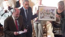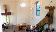 Besondere Dankbarkeit zeigte Pfr. Dietz auch für das große Engagement der Organisatoren, sowie vieler Lützelsachsener Gemeindeglieder, die zum Gelingen des Jubiläumstreffens am vergangenen Wochenende beigetragen haben. Als Gastgeschenk erhielt die Lützelsachsener Kirchengemeinde eine Kopie des Aquarells von Alexander Gsteu: „Das Schönfelder Abendmahl“. Es zeigt die 11 Kirchen des Pfarrsprengels, das Jugend- und Pfarrhaus um den Abendmahltisch mit dem Malchower Sterne-Labyrinth - dieses Geschenk wird sicher einen Ehrenplatz bei uns bekommen. Jeder Gottesdienstbesucher erhielt eine Postkarte des Aquarells.
