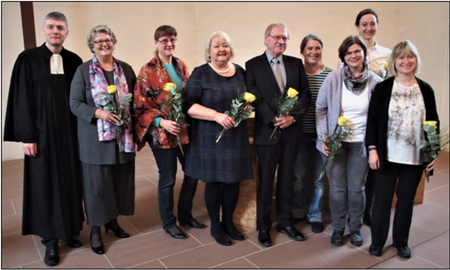 Der neue Kirchengemeinderat mit Pfr. Rohland, von links: Dr. Monika Rimmler, Regina Oxenius, Christiane Bylitza, Hermann Müller, Doris Rosenzweig Gräfin von Keyserlingk, Beate Preuss, Dr. Lisa Lehmann, Heike Berggötz