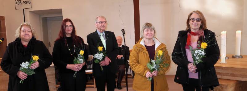 Die Kirchengemeinderäte, die aus dem Leitungsgremium unserer Gemeinde ausscheiden, wurden mit großem Dank verabschiedet. Nach 24 langen und bewegten Jahren hat Frank Peter Klein nicht mehr für den Kirchengemeinderat kandidiert, ebenso nach 18 Jahren die Vorsitzende Traute-Rose Schrem, nach 15 Jahren Prof. Dr. Hans-Jochen Bartels, nach 12 Jahren Thomas Wöhlke und nach 6 Jahren im Kirchengemeinderat Elisabeth Schmitt sowie Kirsten Staemmler. Für ihr langjähriges ehrenamtliches Engagement in dieser Funktion hat ihnen Pfarrer Rohland im Namen unserer Gemeinde herzlich gedankt.